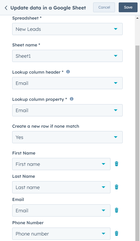 Mapping your properties to your spreadsheet’s columns will result in your spreadsheet automatically being populated with each new workflow enrollment.